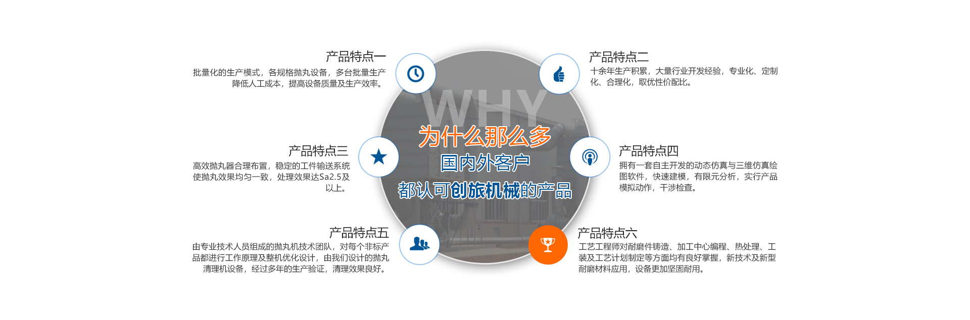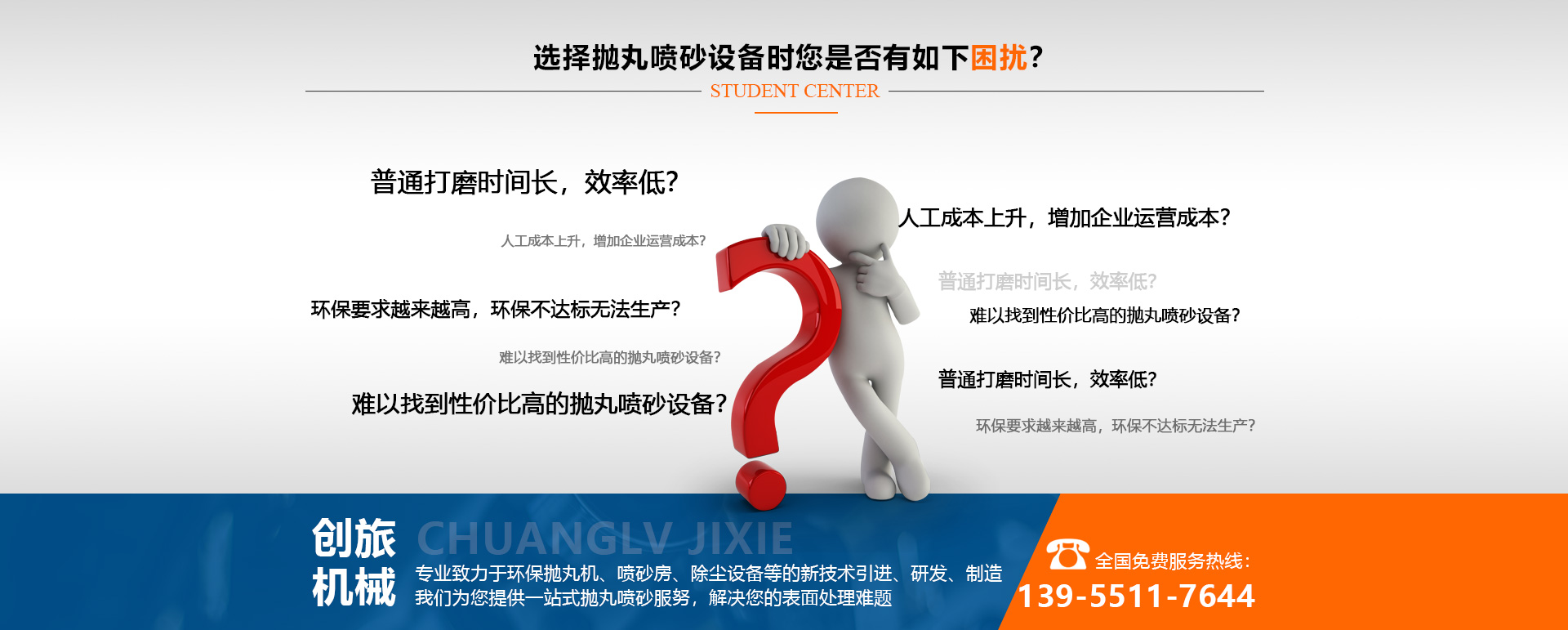 合肥市創旅機械有限公司是專業的噴砂房、拋丸機生產廠家,生產不同型號不同價格的江蘇拋丸機、江蘇 噴砂房、除銹機、拋丸清理機械、自動噴砂機械、通風除塵設備、砂處理成套設備、鋼丸及各種耐磨合金 件的大型專業化制造企業。 我公司愿與各行各業的朋友交往與合作,使您的產品更光彩! 產品有:鋼板預處理生產線,噴砂房,噴砂機械,噴砂設備,拋丸機,拋丸清理機,混砂機,噴丸機 ,拋 噴丸機,履帶式拋丸清理機,鋼板除銹機,鋼材除銹機,板...